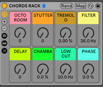 This rack was created for use with chords and pads to help add in dreamy soundscapes, additional sounds, as well as delays and reverbs. 8 knobs to mess around with for endless chord and pad fun.