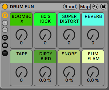 Add boom, reverb, and distortion all with these 8 knobs of drum fun. Useful for producing, arranging, and performing drums.